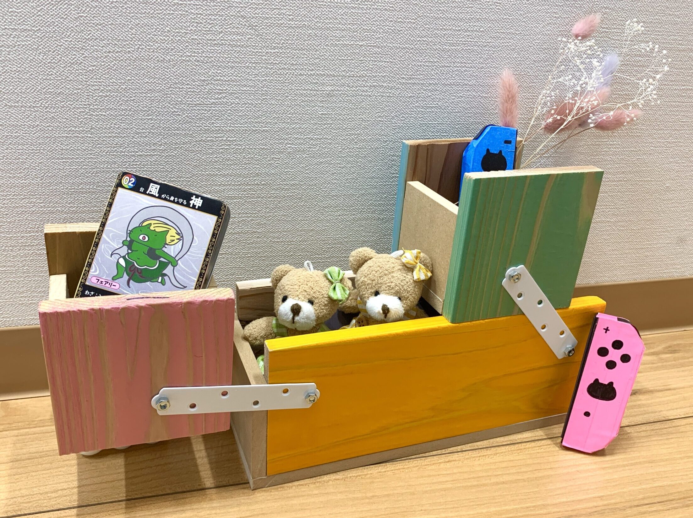 金属パーツ(一文字継手)とボルトやナットを使用し、箱同士を連結して可動部を作ります。