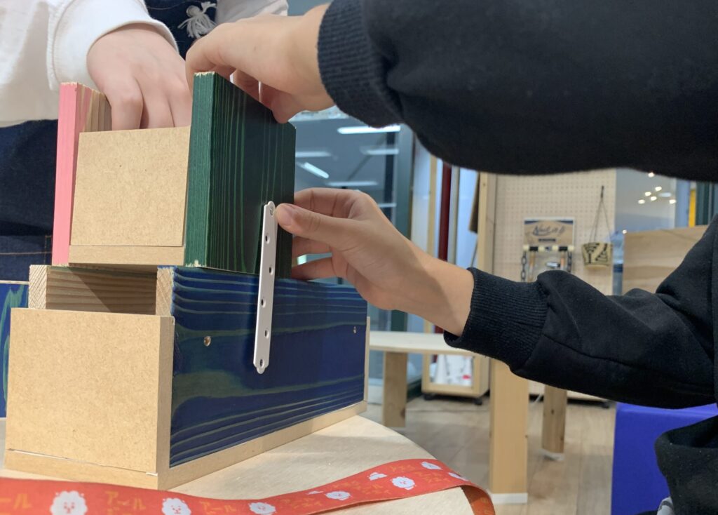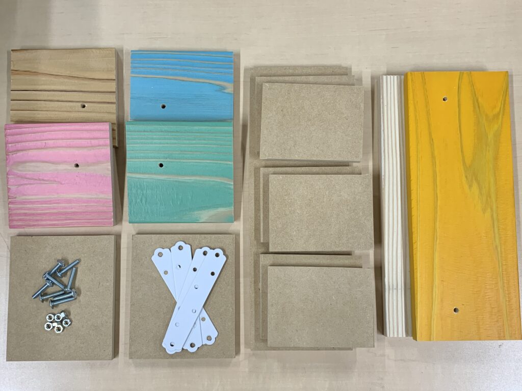 - 10色以上のカラー木材から、自分の好きな6枚を組み合わせて制作。パーツの選び方で、参加者の個性が色濃く反映されます。